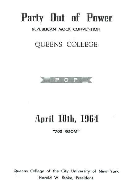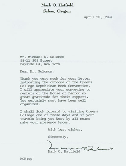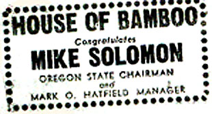 It was a great day of triumph for House of Bamboo on April 18, 1964 at the "Party Out of Power " Republican Mock Convention at Queens College. House of Bamboo constituted the Oregon delegation and its candidate was the then Great Governor of Oregon, Mark O. Hatfield. Starting with only nine delegate votes, the HOB delegation managed to secure the Republican nomination for Governor Hatfield. |